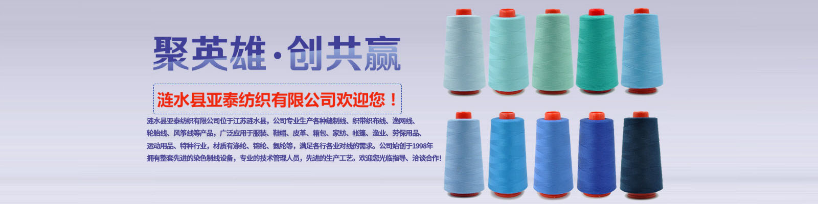 漣水縣亞泰紡織有限公司位于江蘇漣水縣,公司專業(yè)生產(chǎn)各種縫制線、織帶織布線、漁網(wǎng)線、輪胎線、風(fēng)箏線等產(chǎn)品,廣泛應(yīng)用于服裝、鞋帽、皮革、箱包、家紡、帳篷、漁業(yè)、勞保用品、運(yùn)動(dòng)用品、特種行業(yè),材質(zhì)有滌綸、錦綸、氨綸等,滿足各行各業(yè)對線的需求。公司始創(chuàng)于1998年,擁有整套先進(jìn)的染色制線設(shè)備,專業(yè)的技術(shù)管理人員,先進(jìn)的生產(chǎn)工藝。歡迎您光臨指導(dǎo)、洽談合作!